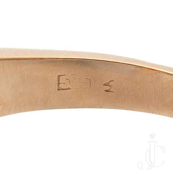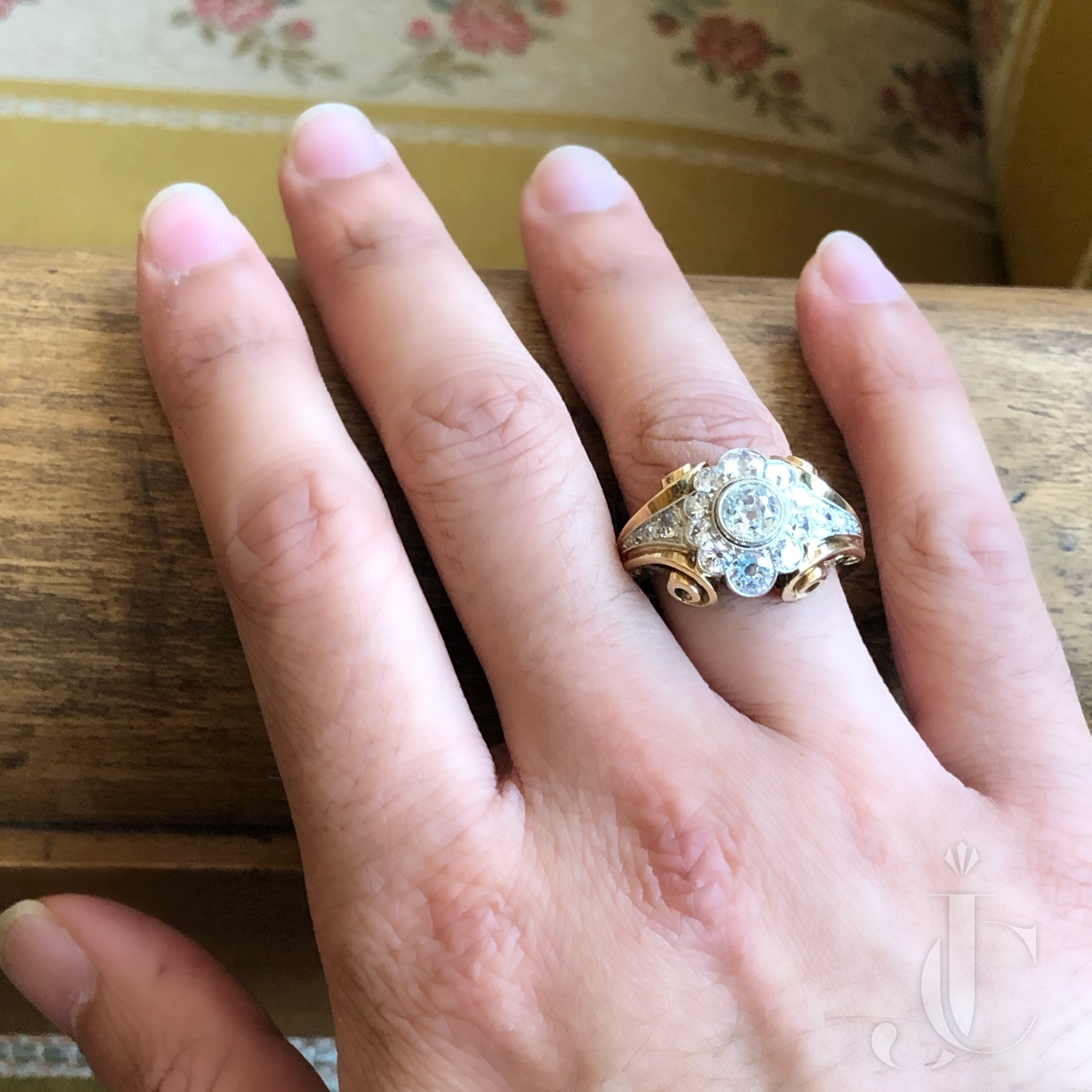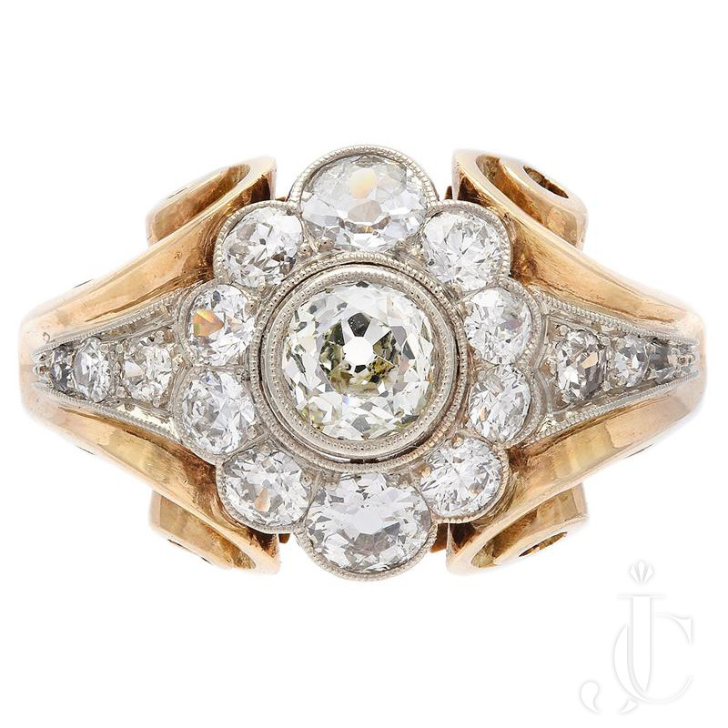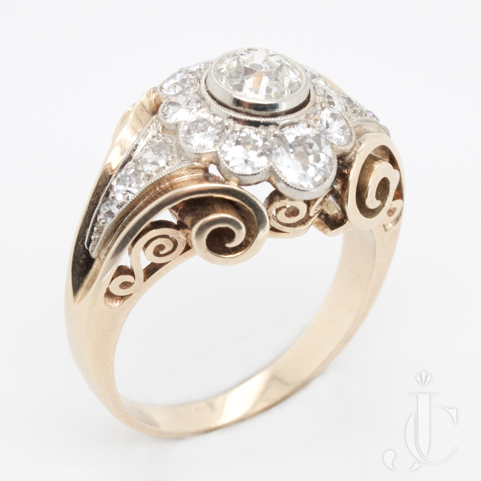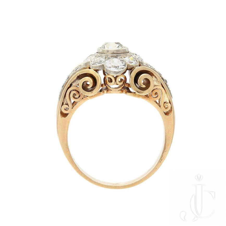 A highly decorative diamond retro ring, ca. 1950s. The ring is in 14k yellow gold and has a very fine craftsmanship. The profile has a swirly curvaceous design while the top of the ring is set with a diamond entourage around the centre stone. The total diamond weight is approximately 2.5-3 carats. The ring has a 585 gold stamp mark as well as rubbed makers marks.