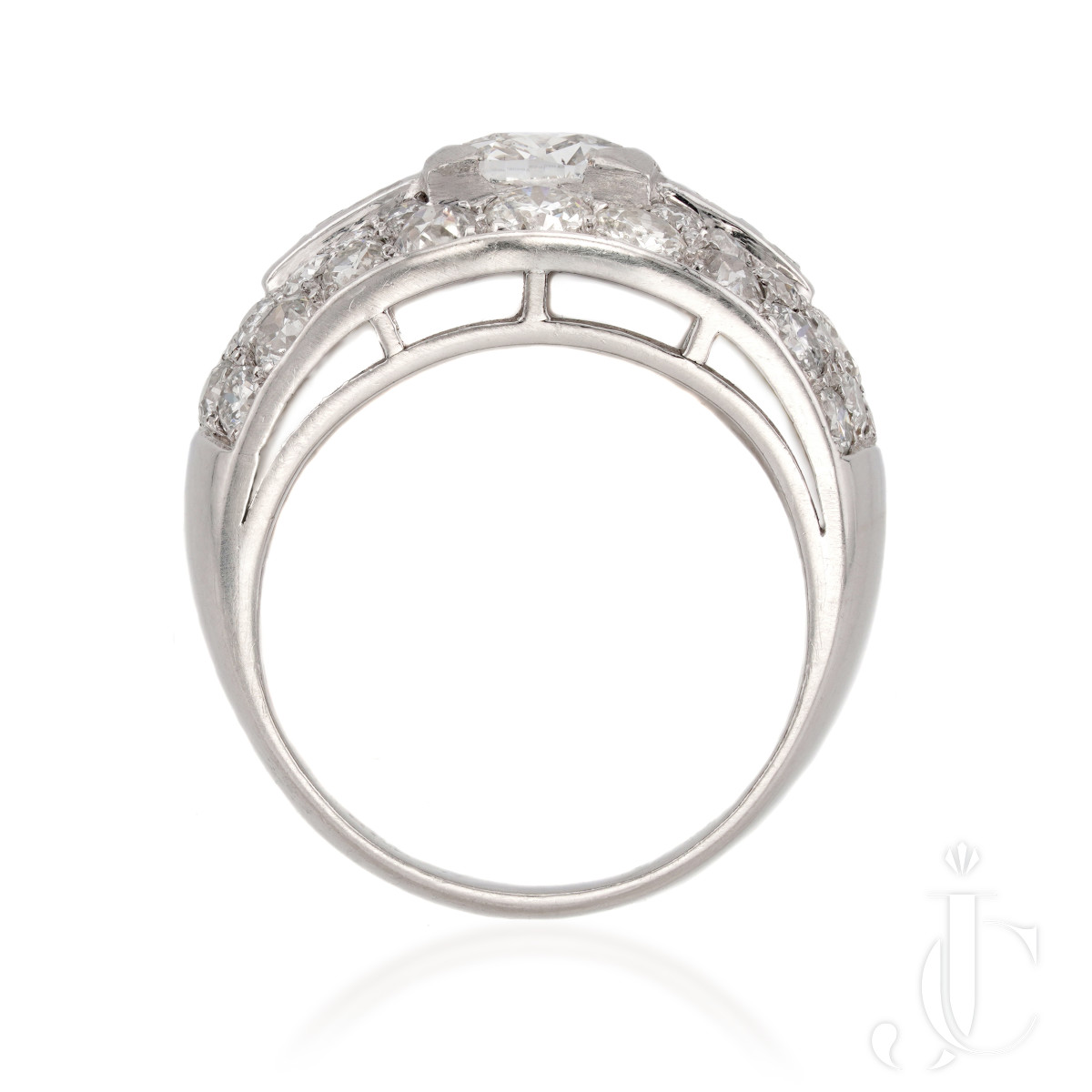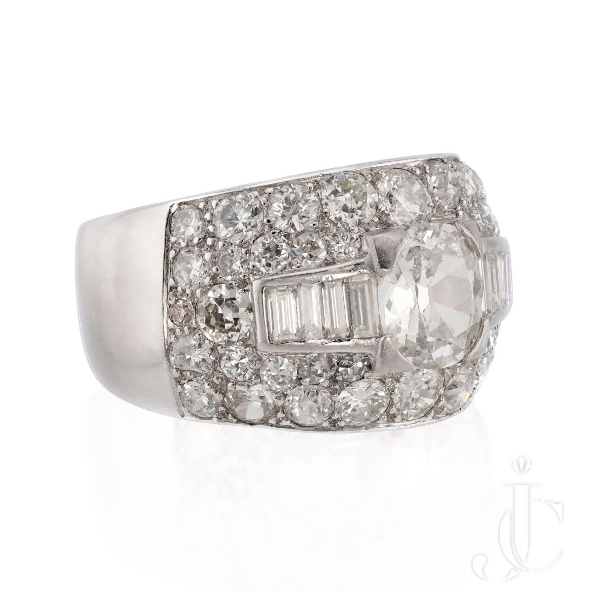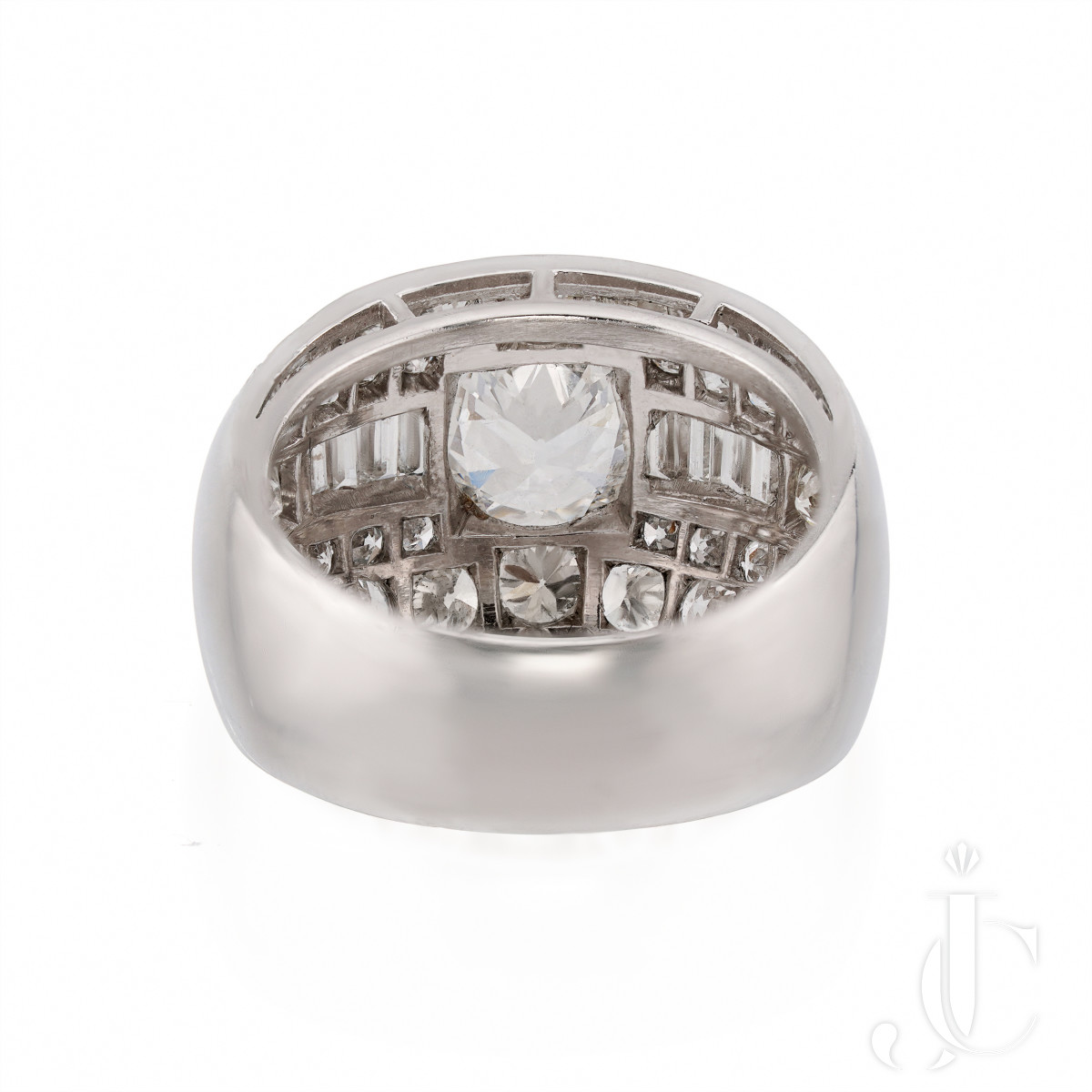 Middle stone 1.71cts cushion cut SI2 G (GIA report), flanked by rows of 8 baguette diamonds, and 42 pave set diamonds approx 1.55 cts