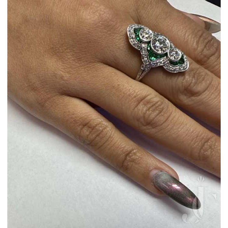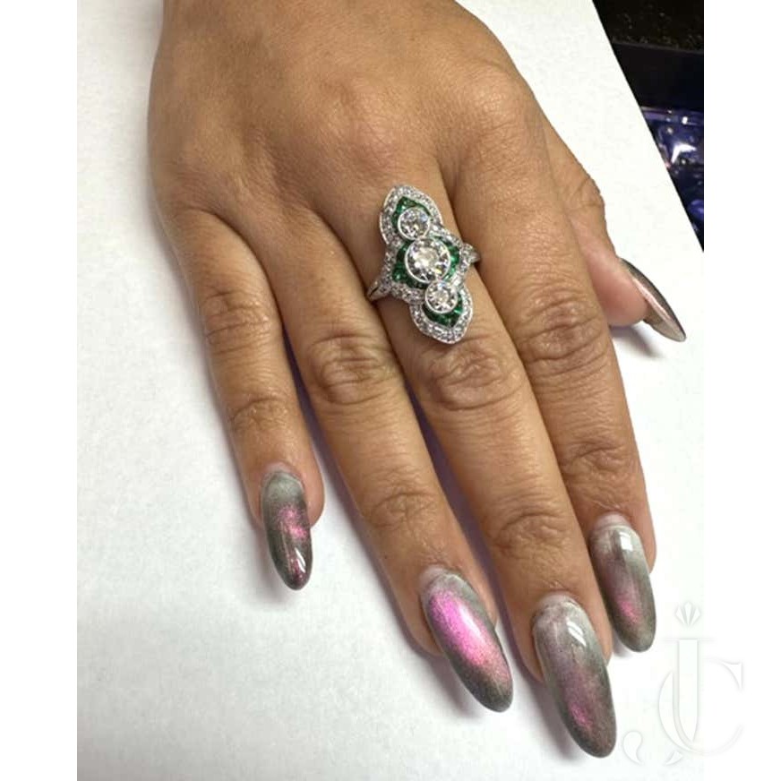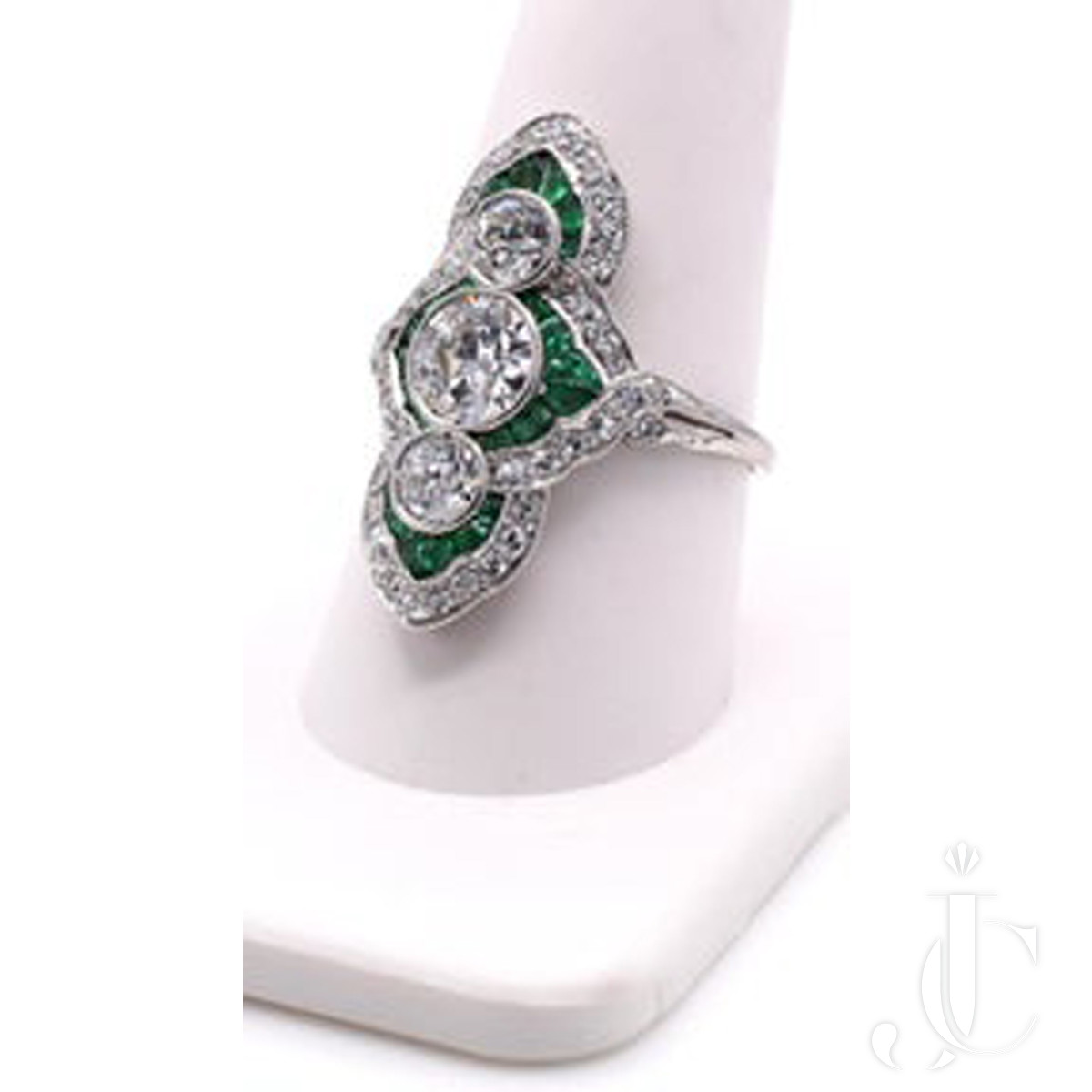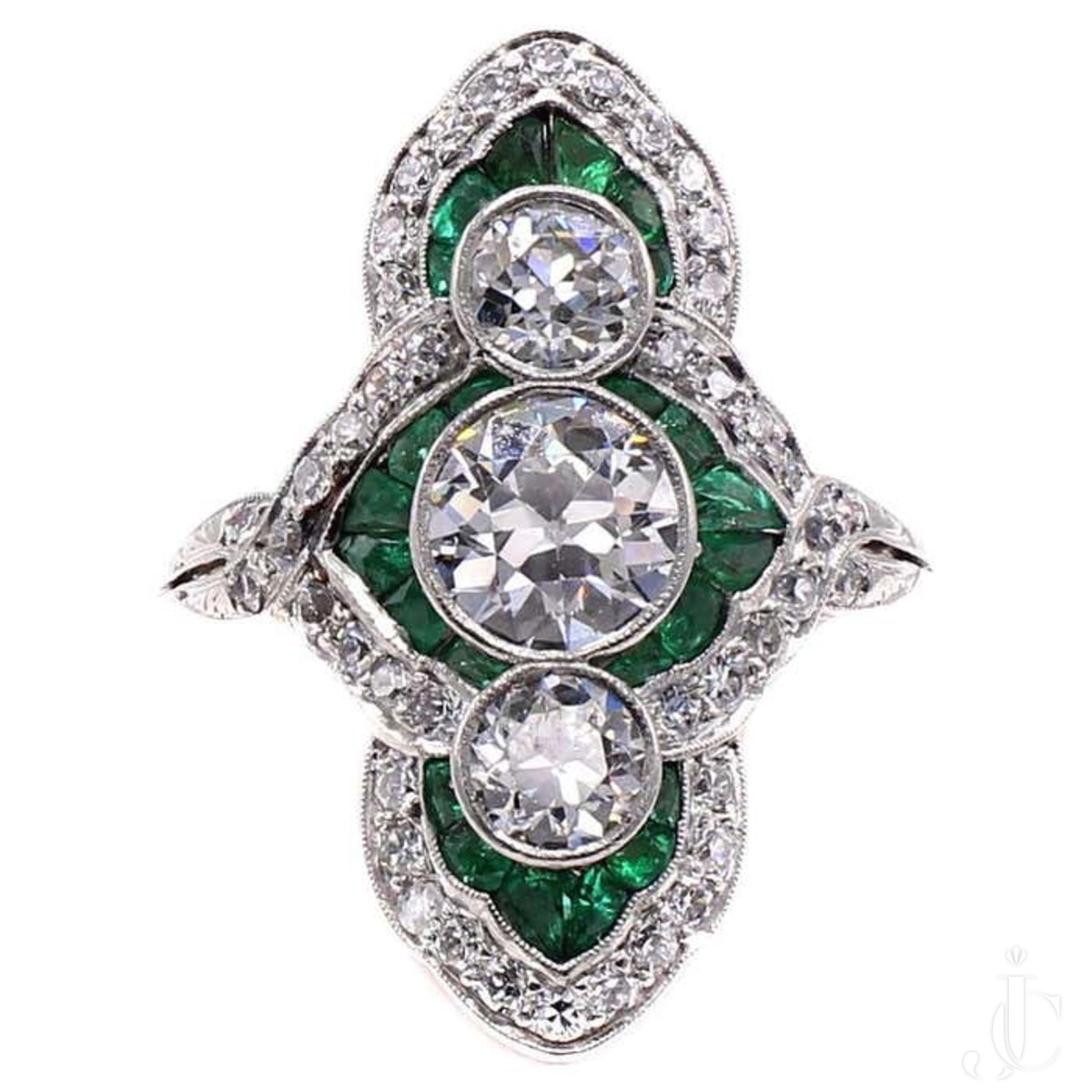 Exquisite Art Deco engagement ring from ca. 1925. Beautifully designed and masterfully handcrafted in platinum, this unique ring is set with three center Old European cut diamonds with a total approximate weight of 2 carats. Embellishing the center diamonds are forest green perfectly matched caliber emeralds and an outer row of bright white round old cut diamonds. Ring size 9.25 and can be sized.