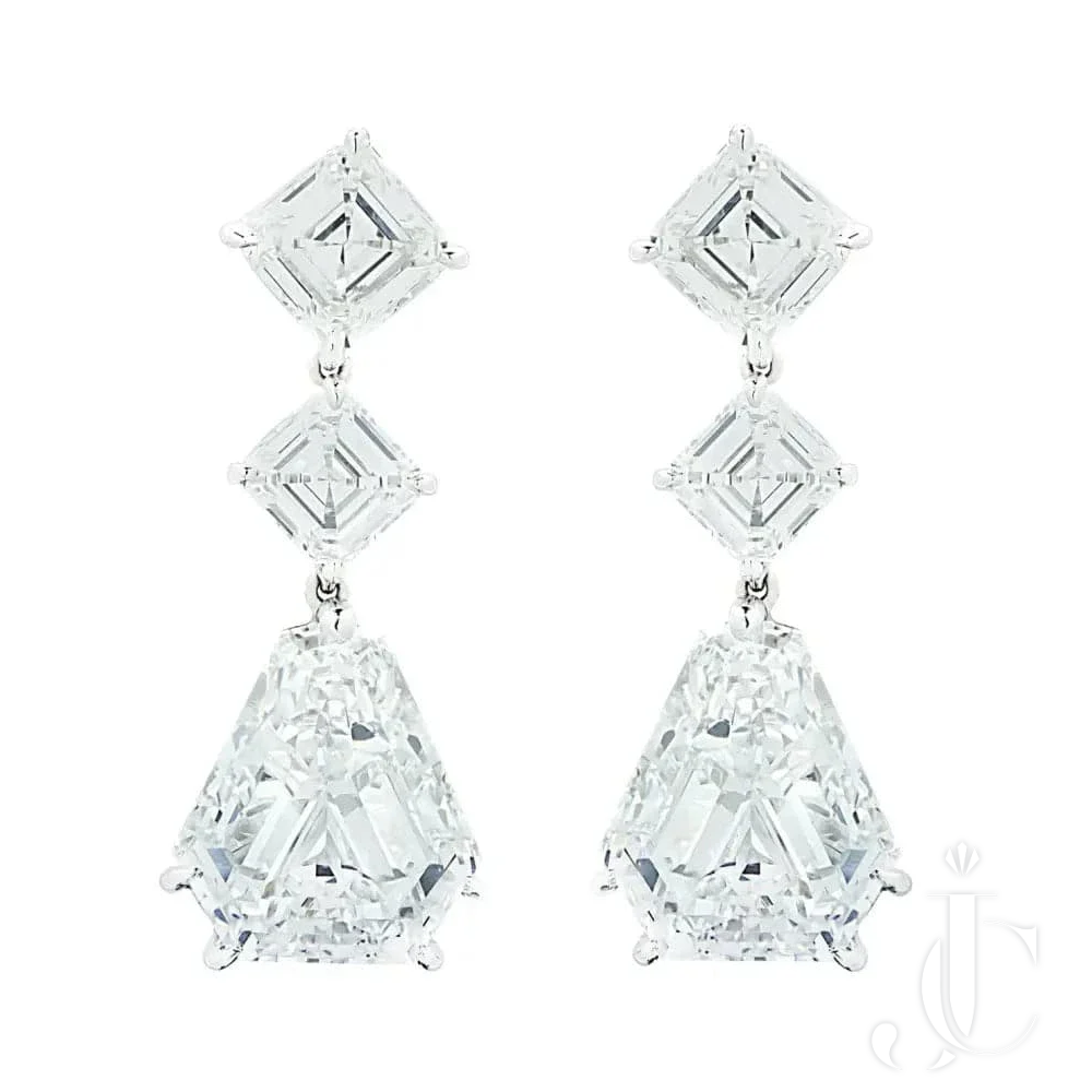 Hailing from the esteemed House of Bvlgari in Italy, these exceptional earrings are part of the highly coveted and rare High Jewelry collection. Originally acquired from Bvlgari for one million dollars, this masterpiece is meticulously handcrafted in platinum. They feature six GIA-certified shield and asscher cut diamonds, collectively weighing 13.97 carats, with impeccable D-F color and VS1-SI1 clarity. Recently serviced at Bvlgari, they come accompanied by service papers and are elegantly presented in their original Bvlgari box.