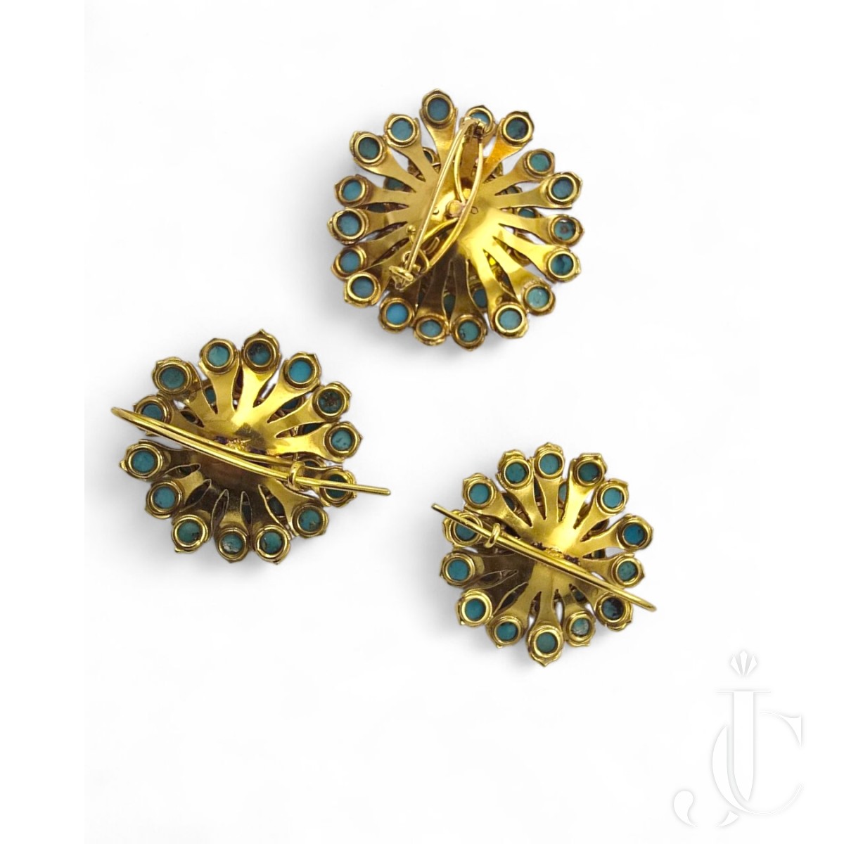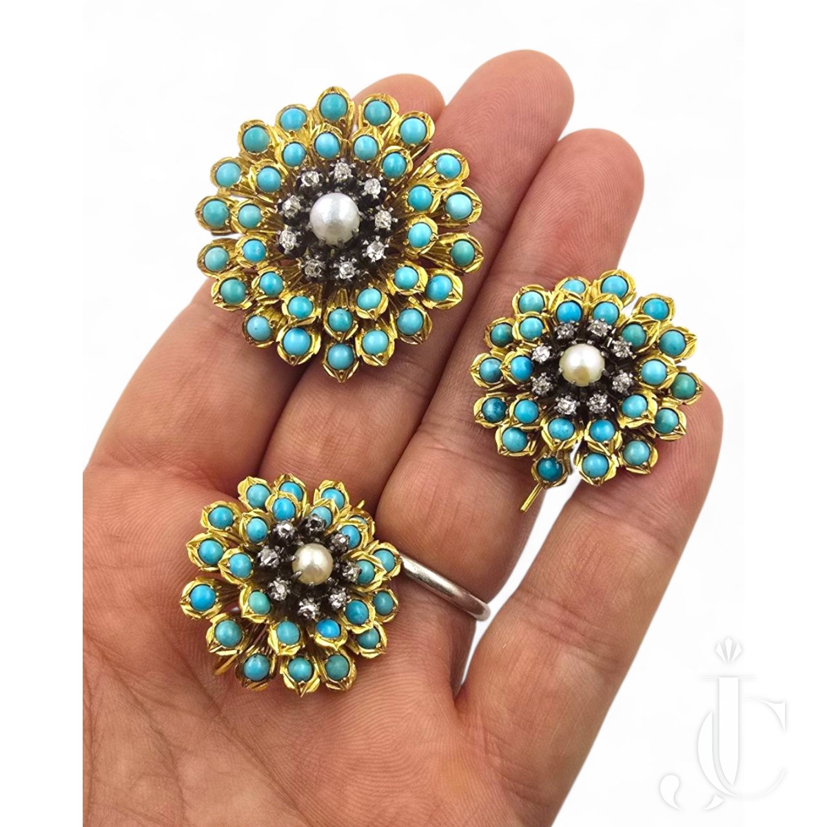 18k gold flowers, the petals set with cabochon turquoises and the centers in silver set with a pearl surrounded by old cut circular diamonds. Pin mechanism and hook mechanism for the earrings. French marks circa 1880's. 51.62 grams total. Earrings 26.73 gr, Brooch 24.94 gr